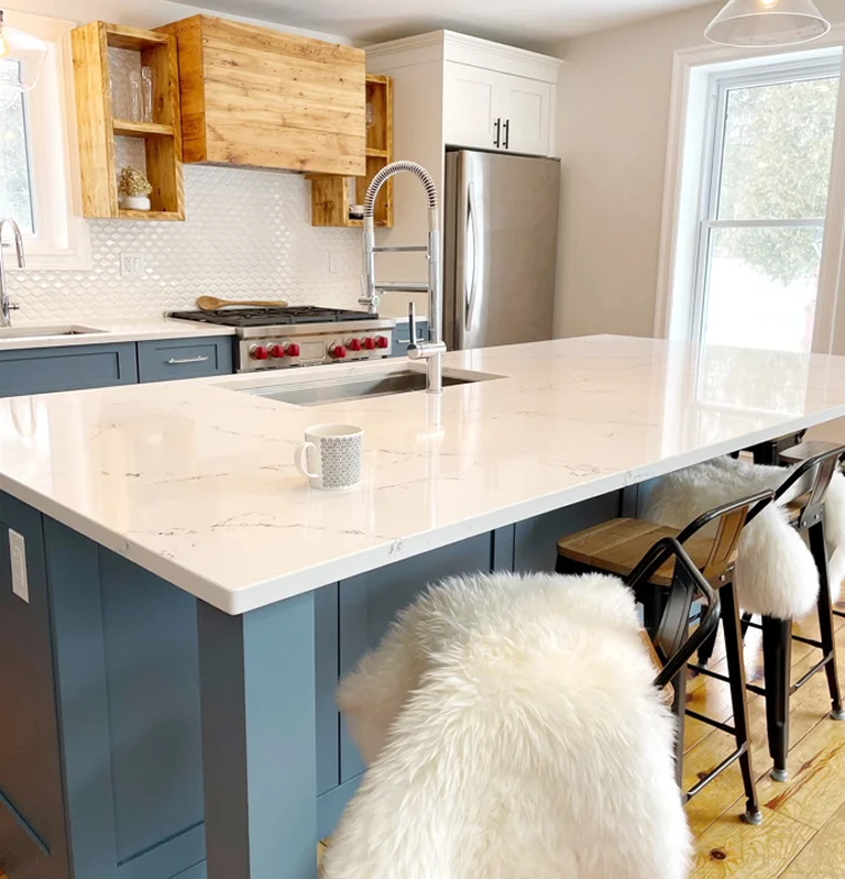 Project Details: Transitional Kitchen – White Shaker Cabinets on Perimeter and Vintage Blue Shaker on Island. Warm Wood Textured Accents. Mixed Metal Tones. Vaulted Ceiling. Cambria Tourquay Countertops and Backsplash.